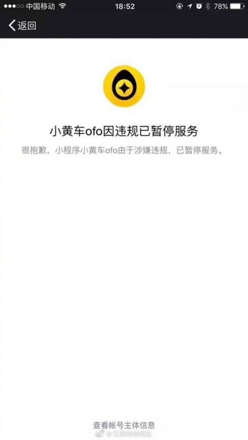 這場爭論之后,網(wǎng)絡即流傳著一張疑似ofo小程序因違規(guī)被封的圖片。TechWeb發(fā)現(xiàn),此截圖中的ofo圖標并非小黃車的logo。TechWeb就此圖向ofo方面求證是否遭遇封號,ofo方面十分必定地體現(xiàn),“ofo沒有小程序,不清楚圖片來自哪里?!保ㄍ趺桑?/p>