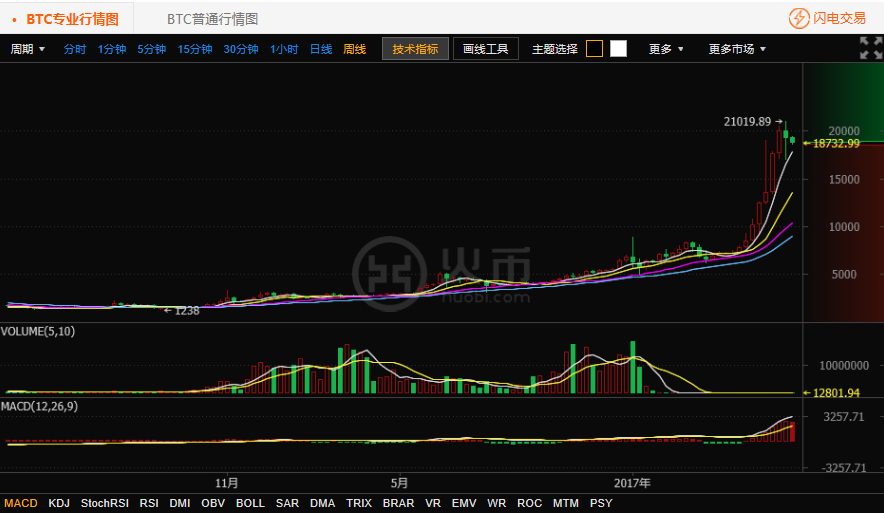 看火幣網(wǎng)比特幣行情周線圖。連續(xù) 7 周的主升浪行情后,火幣網(wǎng)比特幣周線出現(xiàn)兩連陰,但由于調(diào)整幅度有限,目前價(jià)格依然處于 5 日線上方,多頭趨勢(shì)尚未改變??椿饚啪W(wǎng)比特幣行情日線圖。近期在高位進(jìn)行小幅震蕩,前期高點(diǎn) 19000 元附近成為多空雙方主要的爭(zhēng)執(zhí)點(diǎn),資金在該位置博弈明顯。