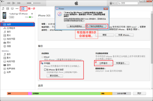 iTunes備份過程很簡單,首先通過USB數據線把電腦和手機進行連接,然后運行iTunes工具。如下圖在iTunes工具中,點擊頂部工具欄的手機圖標按鈕,將會進入手機的辦理摘要界面,然后在備份欄目里,勾選“本電腦”(必然不要勾選“給iPhone備份加密”選項),最后點擊“立即備份”按鈕開始備份手機數據。
