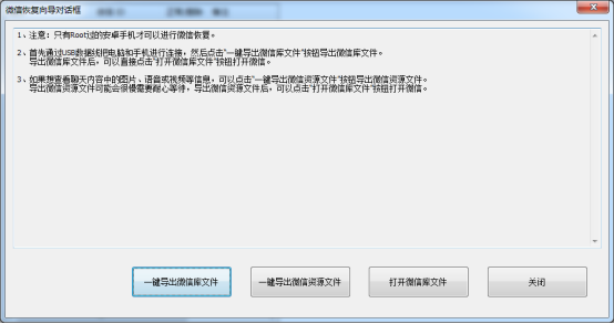 在“微信恢復向導”對話框中,首先通過USB數據線把電腦和手機進行連接,然后如下圖點擊“一鍵導出微信庫文件”按鈕導出微信庫文件。然后點擊“打開微信庫文件”按鈕,就可以打開需要恢復微信的聊天記錄的瀏覽頁面。
