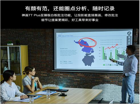 舉個例子,在給員工培訓、向客戶做工作報告請示或提案時,一般會涉及到PPT講解,傳統(tǒng)投影操作大都機械繁瑣,而使用神畫智能投影內(nèi)置的觸控智能辦公功能,瞬間便能達到令人刮目相看且與眾差別的溝通效果,好比有重要內(nèi)容需要強調(diào)時,可以輕松用神畫智能投影“白板批注”的強大功能提醒或強化PPT的重點部分。