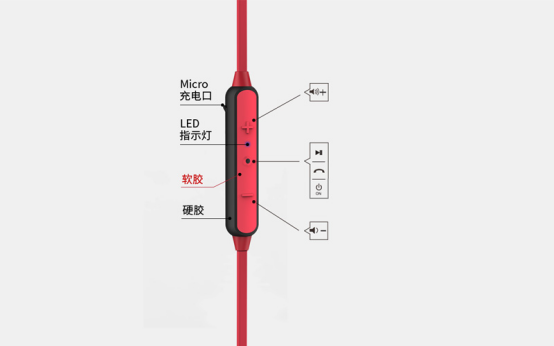 S01 耳機中控為防水設(shè)計,防止汗液侵入中控。而中控采用軟膠和硬膠結(jié)合而成,以保證按鍵手感舒適,開關(guān),切換上下曲、音量、接聽電話都在耳機中控進行操作!