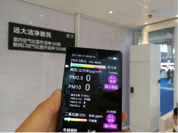 此次參展,遠(yuǎn)大潔凈空氣展廳內(nèi)不雅觀展者絡(luò)繹不絕,現(xiàn)場(chǎng)工作人員還準(zhǔn)備了環(huán)境儀——一款空氣檢測(cè)設(shè)備,供民眾在現(xiàn)場(chǎng)對(duì)遠(yuǎn)大空氣凈化產(chǎn)品進(jìn)行檢測(cè)。遠(yuǎn)大在現(xiàn)場(chǎng)打造了一間裝有遠(yuǎn)大潔凈新風(fēng)機(jī)的體驗(yàn)廳,體驗(yàn)廳內(nèi)空氣檢測(cè)結(jié)果PM2. 5 為 0 微克/立方米,而展會(huì)當(dāng)天北京室外PM2. 5 為 122 微克/立方米?,F(xiàn)場(chǎng)檢測(cè)數(shù)據(jù)對(duì)比之下,遠(yuǎn)大潔凈空氣的產(chǎn)品優(yōu)勢(shì)凸顯,