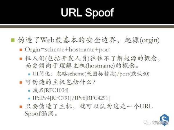 在了解完URL的各個(gè)參數(shù)后,徐少培給出了URL Spoof漏洞的詳細(xì)的定義和說明。地址欄欺騙漏洞,偽造了Web最基本的安適界限,起源(orgin)。