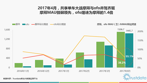 而來自業(yè)內(nèi)知名數(shù)據(jù)機構(gòu)Trustdata的最新數(shù)據(jù)陳訴顯示:共享單車用戶規(guī)模在 2017 年 4 月依然連結(jié)強勁增長勢頭,不過由于此前用戶基數(shù)已經(jīng)很大,因而行業(yè)整體增速較之于 3 月份呈現(xiàn)出必然的下降。作為行業(yè)雙雄的ofo與摩拜在 4 月份的環(huán)比增長率別離為55.1%和38.2%,ofo繼續(xù)領騎行業(yè),同時這也是Trustdata統(tǒng)計以來ofo連續(xù)第 8 個月超越摩拜。
