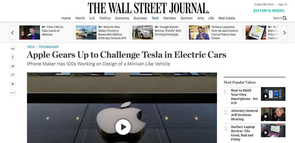 僅僅兩天之后,《華爾街日報》在科技版面頭條頒發(fā)了《蘋果將在電動車領域挑戰(zhàn)特斯拉》的文章,體現(xiàn)蘋果已經(jīng)抽調(diào)大量人員從事汽車研發(fā),并從特斯拉招募了一百多人。