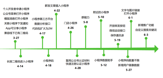 4 月以來,小程序加速釋放新能力,通過快速創(chuàng)建小程序帳號,上線“門店小程序”及附近的小程序,開放小程序第三方平臺,推出小程序碼、公眾號關聯(lián)小程序、小程序自定義關鍵詞能力,進一步降低小程序的開發(fā)門檻,拓展基礎能力和辦事場景,讓小程序與微信現(xiàn)有場景進行連接,同時更好地被微信用戶發(fā)現(xiàn)和找到。