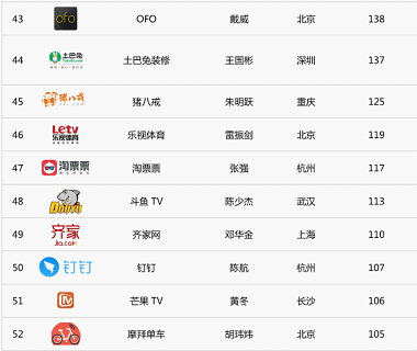 估值是衡量創(chuàng)新型企業(yè)發(fā)展前景的重要指標,ofo小黃車在估值上一直連結(jié)行業(yè)領(lǐng)先地位。本年 3 月,在界面新聞發(fā)布的 2017 年創(chuàng)業(yè)估值榜中,ofo排名總榜第 43 名,擊敗第 52 名摩拜單車。ofo估值為摩拜1. 3 倍之多,奪得共享單車“頭把交椅”。