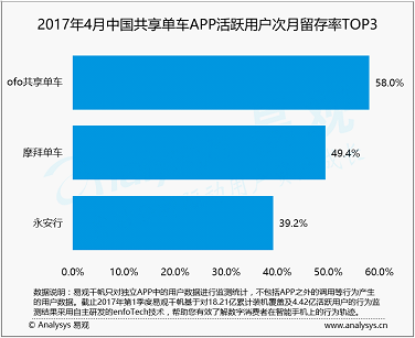 按照第三方權(quán)威數(shù)據(jù)機構(gòu)易不雅觀陳訴顯示,本年 4 月,ofo小黃車APP活躍用戶次月留存率達到58.0%,領(lǐng)先于摩拜單車和永安行,排名行業(yè)第一。