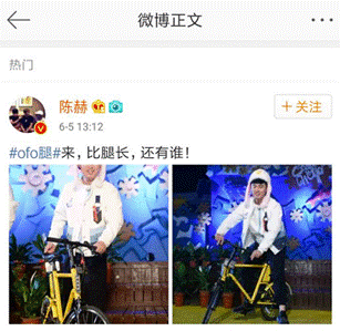 “ofo腿”的尺度姿勢(shì)為單腿直立,另一條腿踏在ofo小黃車的腳蹬上自然彎曲。天才陳赫微博搞事情:“#ofo腿#來(lái),比腿長(zhǎng),還有誰(shuí)”,引發(fā)了眾多圈中好友和粉絲們的調(diào)侃。@包貝爾回復(fù)到:“都?jí)虿坏降亍?,真是夠耿直。?dāng)然包包的說(shuō)法也是有些夸張了,ofo小黃車的精巧架構(gòu)還是很顯腿長(zhǎng)的,照片里的赤赤腿長(zhǎng)一米五真的不過(guò)分。