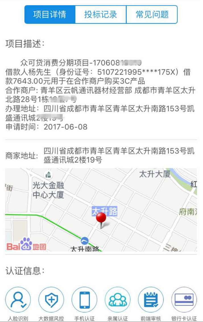 眾可貸消費(fèi)分期項(xiàng)目每一筆業(yè)務(wù)均可查看到借款人姓名、身份證號(hào)碼(為掩護(hù)借款人隱私故部分隱藏)、借款金額、借款時(shí)間,并通過(guò)眾可貸PC端及APP端的標(biāo)的詳情頁(yè)面采用地圖展示準(zhǔn)確的管理地址及商戶名稱,業(yè)務(wù)流向完全真實(shí)透明。