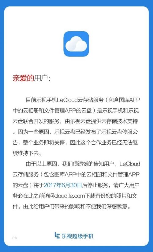 樂視官方稱,樂視云存儲辦事(包羅圖庫APP中的云相冊和文件辦理APP的云盤)將于 2017 年 6 月 30 日后停止辦事,請廣大用戶務(wù)必在此之前拜候