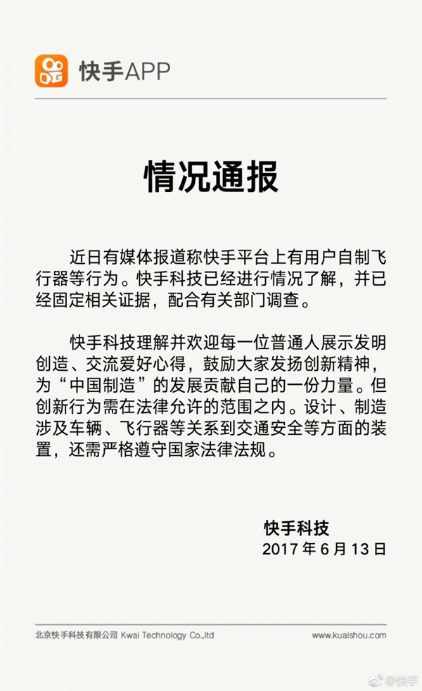 對此,昨天下午,快手科技通過其官方微博回應稱,就“媒體報道稱快手平臺上有用戶便宜飛行器等行為”,快手科技“已經(jīng)進行情況了解,并已經(jīng)固定相關證據(jù),配合有關部門調查”。