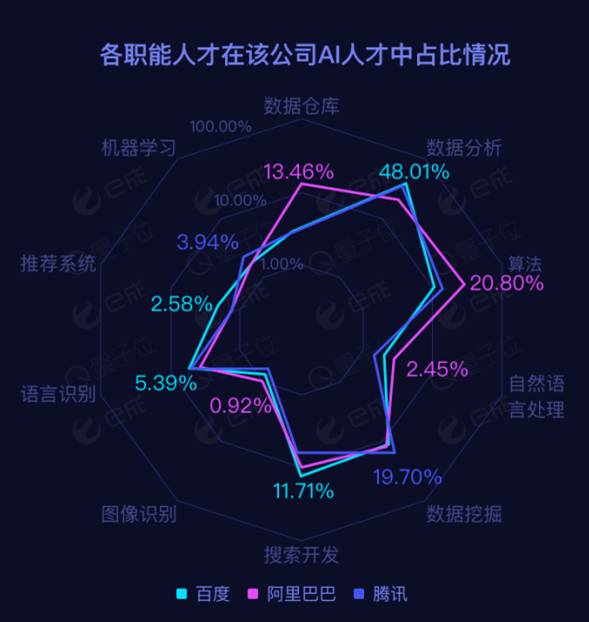 e成大數(shù)據(jù)研究院體現(xiàn),三家公司的AI人才架構(gòu)都是圍繞其核心業(yè)務(wù)展開。依據(jù)各家核心業(yè)務(wù)的差別,在AI人才本能機(jī)能布局上也各有側(cè)重:百度重搜索、阿里優(yōu)策略、騰訊重分析。
