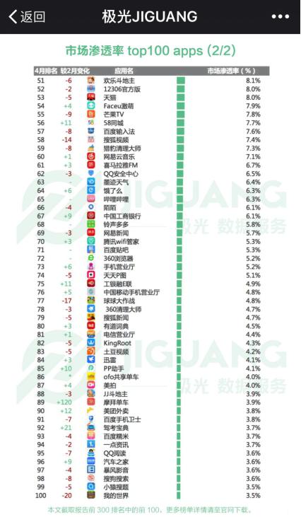 而同時,在最新權(quán)威數(shù)據(jù)極光大數(shù)據(jù)發(fā)布的《 2017 年 4 月App風(fēng)云榜》顯示,在市場滲透率方面,ofo以高達(dá)4.04%的市場滲透率穩(wěn)居行業(yè)第一,摩拜單車以3.87%滲透率跟隨其后。更值得一提的是,ofo的滲透率始終連結(jié)著較快的增速,成為 4 月整個榜單中的最大黑馬;摩拜排位上升也較快,但仍落后于ofo。