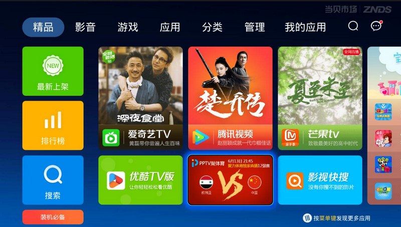 智能電視及網(wǎng)絡(luò)機(jī)頂盒用戶,開啟設(shè)備后先連接網(wǎng)絡(luò),然后打開第三方應(yīng)用當(dāng)貝市場(chǎng)()。當(dāng)貝市場(chǎng)是目前智能電視行業(yè)最專業(yè)權(quán)威的電視應(yīng)用下載安裝市場(chǎng),涵蓋了直播、點(diǎn)播、游戲、工具等所有TV端應(yīng)用。新手用戶可通過U盤就可以成功安裝當(dāng)貝市場(chǎng)。