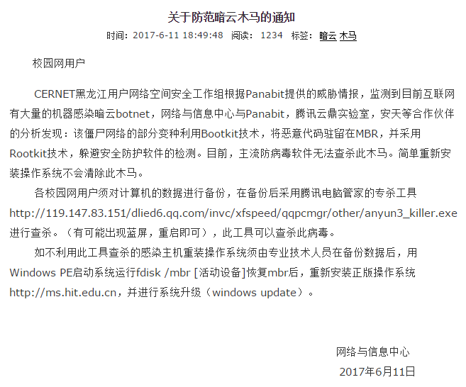 針對此次來勢洶洶的“暗云Ⅲ”病毒,騰訊電腦管家、金山、知道創(chuàng)宇、騰訊云等國內(nèi)安適廠商及云辦事商積極響應(yīng),謹(jǐn)防勒索病毒式的網(wǎng)絡(luò)危機(jī)再次發(fā)生。而在 11 日,哈工大援引