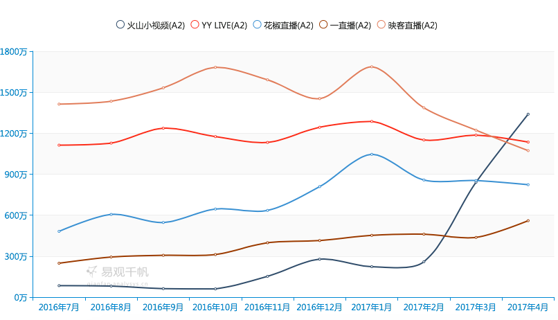 按照易不雅觀千帆的監(jiān)測數(shù)據(jù)能夠看到,從2017年1月開始,包孕映客、YY Live、花椒直播等在內(nèi)多家排名靠前的直播平臺,月活用戶數(shù)量均出現(xiàn)了明顯下滑,一個月期間就減少了幾十萬到幾百萬不等。