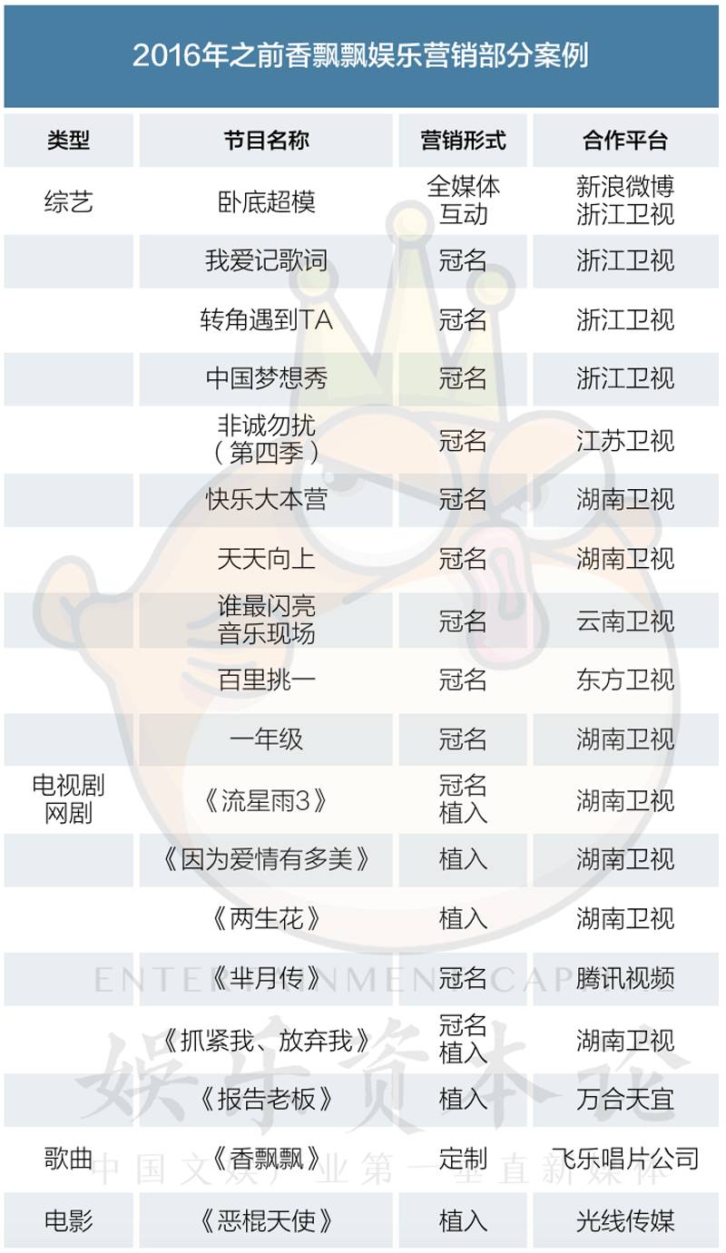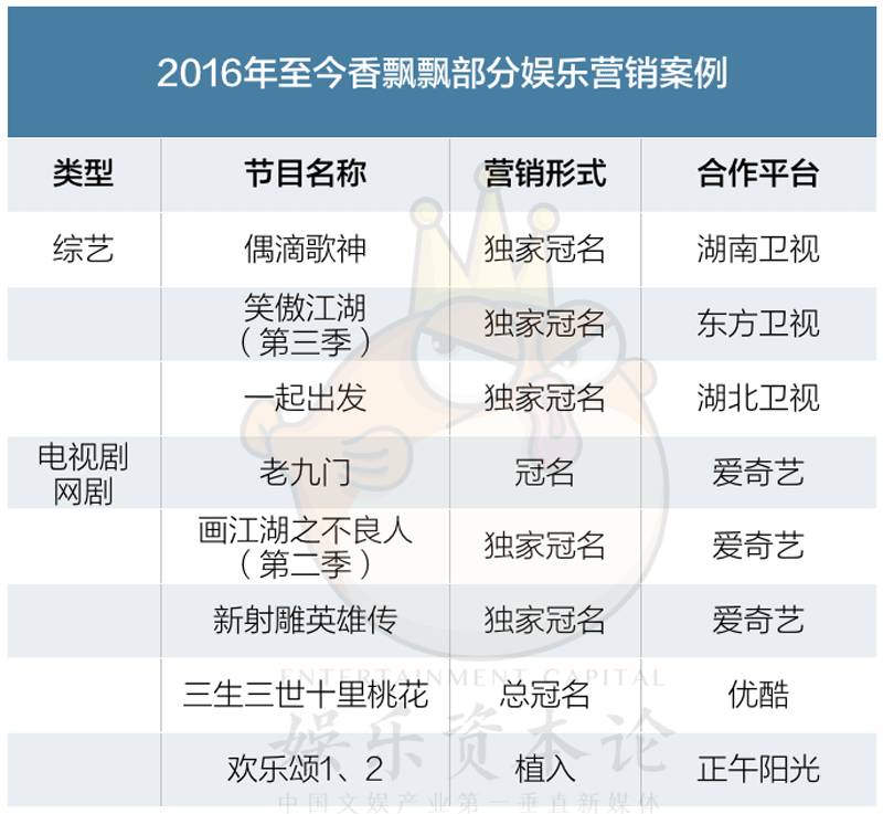 2016年,香飄飄冠名了包孕《偶滴歌神》、《笑傲江湖》第三季、《一起出發(fā)》等幾檔綜藝節(jié)目。