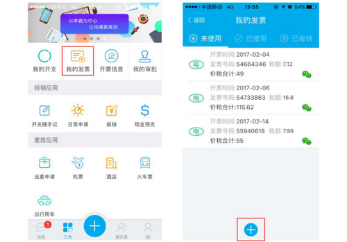 費控寶除了導(dǎo)入、識別和驗證發(fā)票,還可將其關(guān)聯(lián)到費用報銷單:員工在“報銷應(yīng)用”內(nèi)填寫“開支隨手記”,添加“我的發(fā)票”內(nèi)的微信電子發(fā)票,之后在“報銷”功能里進(jìn)行費用單據(jù)的提交即可。