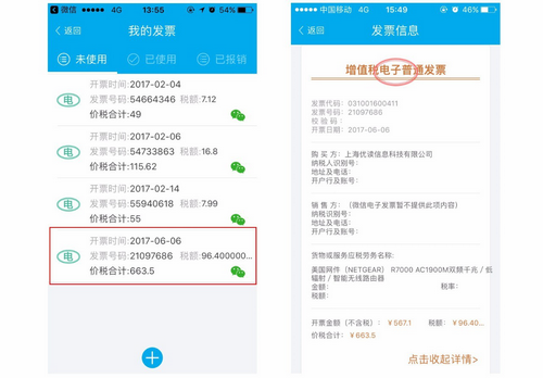 微信電子發(fā)票導(dǎo)入到費控寶后,系統(tǒng)可自動識別、驗證發(fā)票真?zhèn)?。驗證成功后,發(fā)票的“購買方”、“銷售方”、“開票金額”、“稅額”以及購物明細(xì)等信息均會顯示在系統(tǒng)界面上。如果發(fā)票已經(jīng)使用過,系統(tǒng)會提示發(fā)票已經(jīng)使用;如果出現(xiàn)假的發(fā)票,系統(tǒng)會自動提示該發(fā)票不存在。