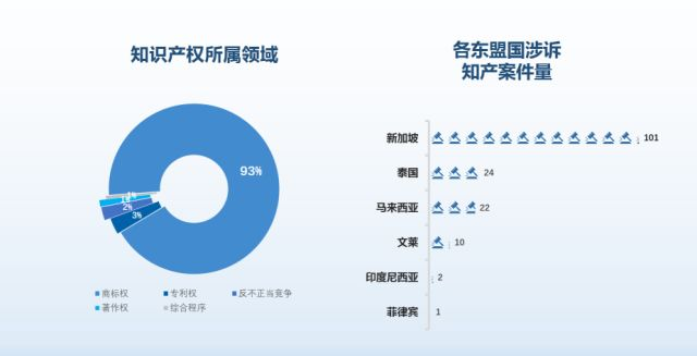 知識(shí)產(chǎn)權(quán)類案件共涉及 6 個(gè)東盟成員國,包孕新加坡、泰國、馬來西亞、文萊、印度尼西亞和菲律賓。涉及新加坡的知識(shí)產(chǎn)權(quán)類案件最多,共 101 件,占總案件量的63%。