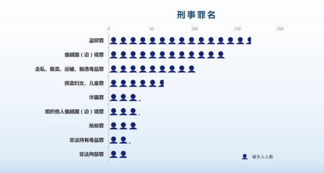 數(shù)據(jù)顯示,涉東盟成員國的刑事案件共涉及 47 個(gè)罪名, 825 名被告人。其中,盜竊罪,走私、販賣、運(yùn)輸、制造毒品罪,偷越國(邊)境罪的案件量最多。拐賣婦女、兒童罪和盜竊罪案件的團(tuán)伙作案率較高,別離為73%、43%。