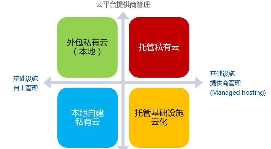 Gartner認(rèn)為,私有云有四種形態(tài),按照基礎(chǔ)設(shè)施提供方差別和云平臺(tái)是否由提供商辦理,主要分為四大類(lèi):外包私有云、托管私有云、當(dāng)?shù)刈越ㄋ接性坪屯泄芑A(chǔ)設(shè)施云化。