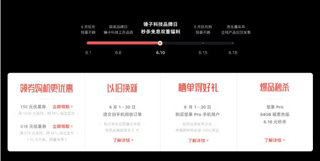 不但產(chǎn)品線更加豐富,并且在品牌日當(dāng)天,網(wǎng)友除可以現(xiàn)貨購買堅(jiān)果Pro外,還可享受京東商城六大專屬福利,包孕限時(shí)秒殺、分期免息、以舊換新享補(bǔ)助等。 6 月 10 日全天 6 輪爆品秒殺,6. 18 元搶堅(jiān)果Pro