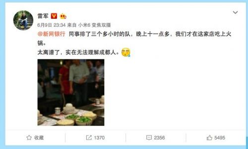 【TechWeb報(bào)道】 6 月 12 日消息,前兩天,雷軍去自家位于成都開業(yè)的新網(wǎng)銀行視察,工作結(jié)束后,新網(wǎng)銀的同事請(qǐng)雷軍吃了頓成都火鍋。沒(méi)想到的是,由于火鍋店生意火爆,雷軍一行人排了三個(gè)多小時(shí)的隊(duì),到晚上十一點(diǎn)多才吃上火鍋。雷軍發(fā)微博感慨:“太離譜了,,實(shí)在無(wú)法理解成都人?!?/p>