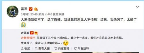 對(duì)于火鍋的口味,雷軍也吐槽稱“辣哭了”,發(fā)微博說(shuō):“大家怕我受不了,選了微辣,我說(shuō)我們湖北人不怕辣!結(jié)果,我快哭了,太辣了”。這條微博已經(jīng)獲得了超過(guò) 2000 條評(píng)論,網(wǎng)友們的神回應(yīng)也是各自精彩。