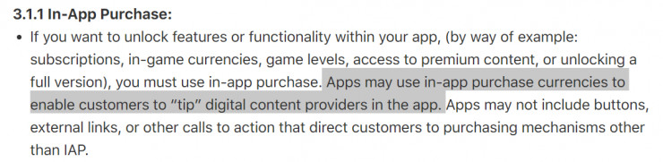 不過,雷鋒網(wǎng)(公眾號(hào):雷鋒網(wǎng))發(fā)現(xiàn),目前中文版的App Store審核指引暫時(shí)還未更新,但是顯然這次的更新主要是針對(duì)中國市場(chǎng)。不過,里面仍然明確規(guī)定,“App 不得包羅指引客戶使用非 IAP 機(jī)制進(jìn)行購買的按鈕、外部鏈接或其他行動(dòng)號(hào)召用語。”