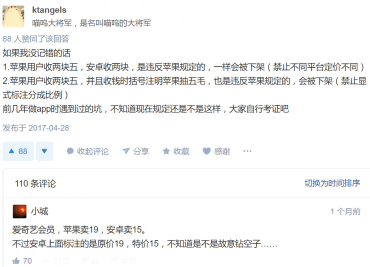 在知乎上的“怎么看待蘋果公司要求分成微信、值乎打賞 32%?”這一問題下,@ktangles體現(xiàn),蘋果的平臺(tái)還存在一些“隱性”規(guī)定。