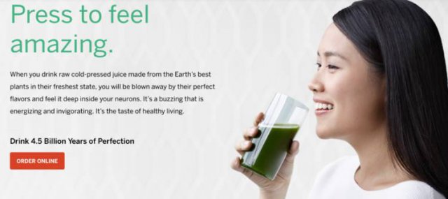 “當(dāng)你喝下我們精心為你準(zhǔn)備的,用地球最好的植物在最佳的時(shí)間榨取的汁液,你將為之沉醉,,每一個(gè)神經(jīng)都會(huì)受到蔬果清新的沖擊。這是一種充滿能量,振奮人心的感覺(jué)。這就是健康之味?!?/span>