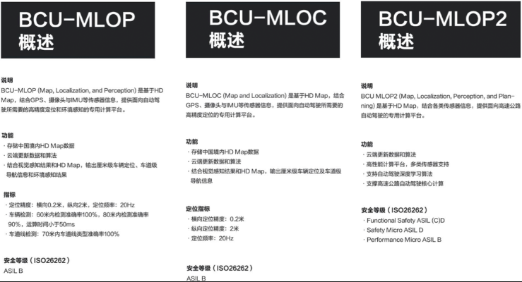 BCU-MLOC定位于提供高精度定位的計算平臺,BCU-MLOP是定位于提供高精度定位與環(huán)境感知的計算平臺,而BCU-MLOP2則在高精地圖定位、環(huán)境感知之外,還提決策規(guī)劃的計算平臺。三者的指標(biāo)如下圖(百度官方指標(biāo)):