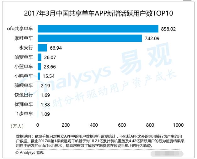 別的,易不雅觀 3 月數(shù)據(jù)也顯示,ofo新增用戶數(shù)同樣遠超摩拜單車及永安行新增用戶的總和。其中,ofo新增用戶數(shù)858. 02 萬人排名第一,摩拜單車新增用戶數(shù)為742. 09 萬人、永安行新增用戶數(shù)為66. 94 萬。