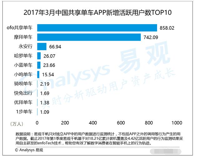別的,易不雅觀 3 月數(shù)據(jù)也顯示,ofo新增用戶(hù)數(shù)同樣遠(yuǎn)超摩拜單車(chē)及永安行新增用戶(hù)的總和。其中,ofo新增用戶(hù)數(shù)858. 02 萬(wàn)人排名第一,摩拜單車(chē)新增用戶(hù)數(shù)為742. 09 萬(wàn)人、永安行新增用戶(hù)數(shù)為66. 94 萬(wàn)。