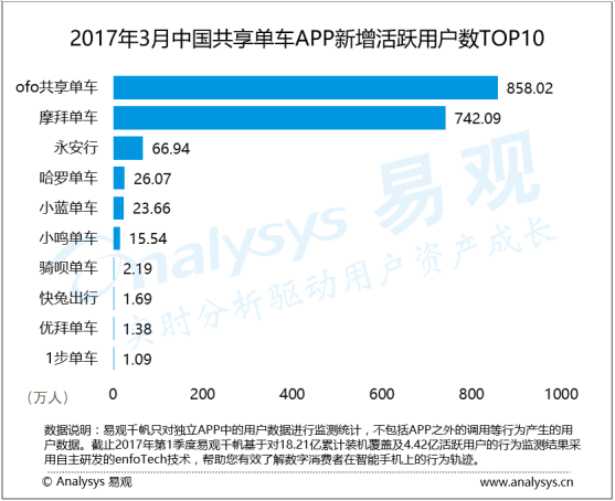 別的,易不雅觀3月數(shù)據(jù)也顯示,ofo新增用戶數(shù)同樣遠(yuǎn)超摩拜單車及永安行新增用戶的總和。其中,ofo新增用戶數(shù)858.02萬人排名第一,摩拜單車新增用戶數(shù)為742.09萬人、永安行新增用戶數(shù)為66.94萬。