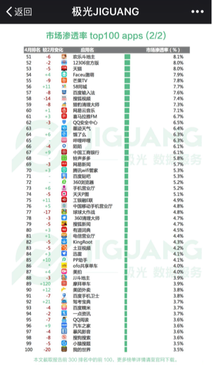 第三方權(quán)威數(shù)據(jù)機(jī)構(gòu)極光大數(shù)據(jù)發(fā)布的《2017年4月App風(fēng)云榜》榜單顯示,共享單車“彩虹大戰(zhàn)”依舊如火如荼,市場(chǎng)形成黃橙兩大“主力選手”,市場(chǎng)滲透率方面,ofo以4.04%的市場(chǎng)滲透率行業(yè)第一。