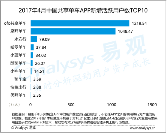 在APP新增活躍用戶數(shù)方面,易不雅觀數(shù)據(jù)顯示,2017年4月份,ofo共享單車APP新增活躍用戶數(shù)1219.54萬人,排名第一,摩拜單車新增用戶為1048.47萬排名第二,永安行新增用戶為79.09萬排名第三。值得一提的是,ofo新增用戶數(shù)超摩拜、永安行總和近百萬,穩(wěn)居行業(yè)第一。