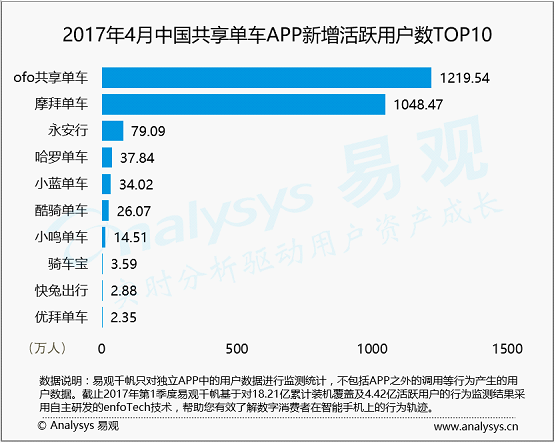 而業(yè)界更為關(guān)注的焦點(diǎn)一直都在共享單車(chē)行業(yè)的發(fā)展格局上,中國(guó)互聯(lián)網(wǎng)市場(chǎng)的大數(shù)據(jù)分析公司易不雅觀最新發(fā)布的《 2017 年 4 月中國(guó)共享單車(chē)市場(chǎng)研究陳訴》顯示, 2017 年 4 月份,ofo共享單車(chē)APP新增活躍用戶(hù)數(shù)1219. 54 萬(wàn)人,排名第一,摩拜單車(chē)新增用戶(hù)為1048. 47 萬(wàn)排名第二,永安行新增用戶(hù)為79. 09 萬(wàn)排名第三。值得一提的是,ofo新增用戶(hù)數(shù)超摩拜、永安行總和近百萬(wàn),穩(wěn)居行業(yè)第一。