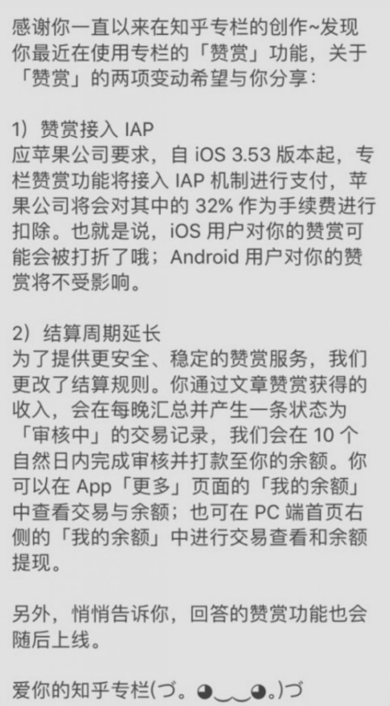 知乎發(fā)布公告稱,應(yīng)蘋(píng)果公司要求,知乎App更新之后,,專欄贊賞功能將接入IAP付費(fèi)機(jī)制,蘋(píng)果公司將從中扣除32%作為手續(xù)費(fèi),也就是說(shuō),用戶只能獲得剩下的68%的贊賞分成。