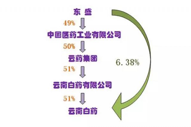 但這些初露端倪的問題并沒有阻止郭家學(xué)進(jìn)一步收購云藥集團(tuán)的計(jì)劃。時(shí)逢云藥集團(tuán)欲引進(jìn)戰(zhàn)略投資者,因旗下?lián)碛忻餍巧鲜泄驹颇习姿?,引來華源集團(tuán)、華潤集團(tuán)、復(fù)星集團(tuán)等醫(yī)藥巨頭展開爭(zhēng)奪。東盛為戰(zhàn)勝強(qiáng)手,不惜曲線救國,繞出個(gè)“九曲十八彎”。東盛先與國藥集團(tuán)組建中國醫(yī)藥工業(yè)公司,讓本身擁有了“國企”身份,其中東盛占49%的股份,再由國藥工業(yè)控股云藥集團(tuán)50%的股權(quán),云藥集團(tuán)擁有云南白藥有限公司51%的股權(quán),而云南白藥有限公司則占有上市公司云南白藥51%的股權(quán)。