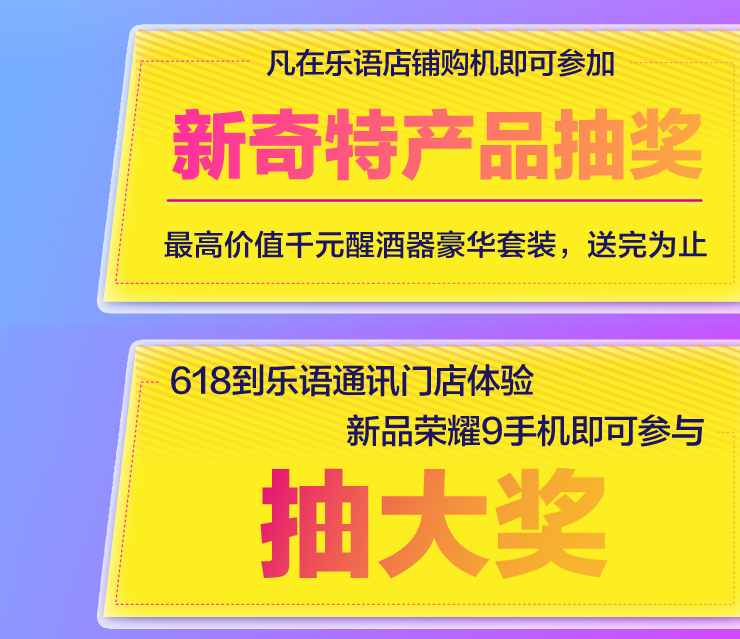 樂語全國2000+門店同樣參與到本次榮耀線下 618 大促中,店內(nèi)購買榮耀 8 與榮耀暢玩6X同樣可領(lǐng)取最高 200 元的購機券,而樂語門店的抽獎活動也別有新意。店內(nèi)購機抽取的均為別致特獎品,例如最高價值千元的醒酒器豪華套裝,,購買榮耀手機,也能同時暢享品質(zhì)生活。別的,樂語店內(nèi)購買新機還可同時管理 99 元的套餐業(yè)務(wù),包羅3GB流量及 700 分鐘通話。而比來正在預(yù)熱期的榮耀旗艦新品“榮耀9”,在發(fā)布后也將加入到樂語門店的線下福利中,消費者只要到店體驗榮耀 9 手機,即可參與抽大獎,這個獎品想想就讓人有些小期待。