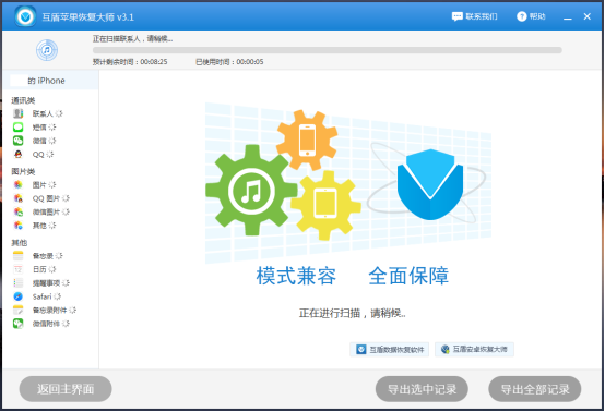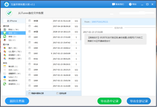 4之后可以在軟件左側(cè)可以看到聯(lián)系人、短信、微信等。右下角別離是“導(dǎo)出選中記錄”和“導(dǎo)出全部記錄”。