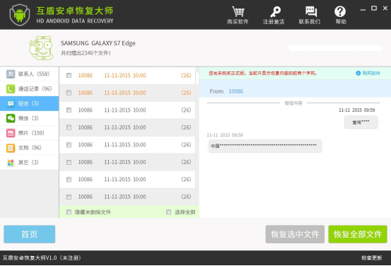 最后,待掃描成功之后,界面左側(cè)會(huì)出現(xiàn)一系列的選項(xiàng),這里既然需要恢復(fù)的短信數(shù)據(jù),那我們就點(diǎn)擊“短信”,之后旁邊會(huì)展示出設(shè)備上之前的短信信息,勾選所需要恢復(fù)的那一項(xiàng),然后點(diǎn)擊“恢復(fù)選中文件”。若是需要恢復(fù)所有的短信,直接點(diǎn)擊“恢復(fù)全部文件”。