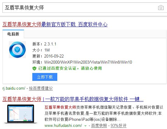 1.打開(kāi)瀏覽器搜索互盾蘋(píng)果恢復(fù)大師并下載至電腦上,點(diǎn)擊“立即安置”。