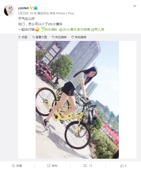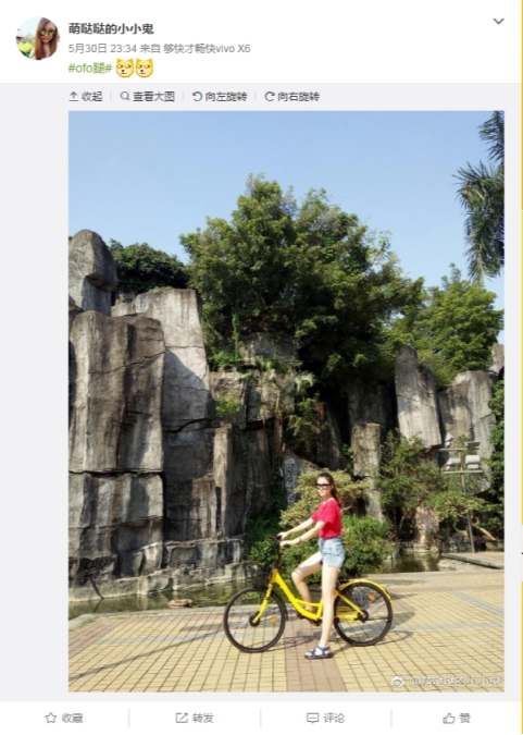 萬輛車,覆蓋率最廣小黃車當(dāng)然也成為人們短途出游的代步好幫忙。夏天的中午晴空萬里,雖然天空中飄著朵朵白云,但午時的熱浪不免讓人有些無力,網(wǎng)友@yasten就直接評釋,出門怎么可以少了ofo小黃車,即能一騎感受夏日的微風(fēng),又能與小黃車一起隨時隨地 360 度來個合影。這波ofo曬腿熱浪隨著這夏日天氣一騎升溫。