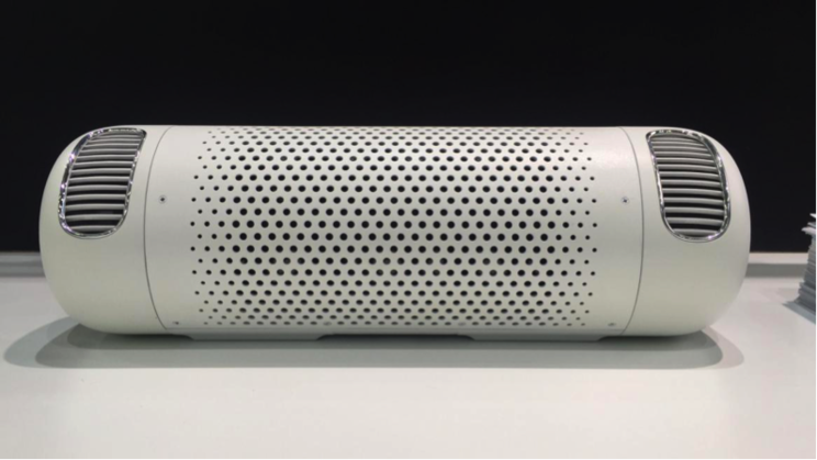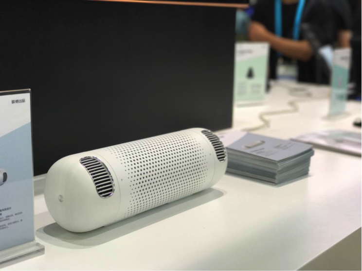 該產(chǎn)品第一眼看像是一款藍牙音響,產(chǎn)品造型與市面上其他車載空氣凈化器有很大差異。據(jù)展會現(xiàn)場工作人員介紹,此款車載空氣凈化器采用一體式桶狀濾芯,結合“雙渦輪”鏡像風機的獨特設計,讓空氣凈化效率有了大幅提升。