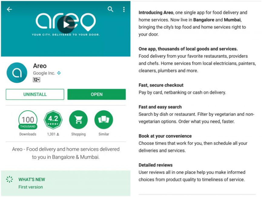 當(dāng)然,谷歌要做的事情,絕不會(huì)是僅投放一個(gè)廣告那么簡(jiǎn)單。 4月13日,谷歌在旗下應(yīng)用商店內(nèi)發(fā)布了一款名為“Areo”的安卓應(yīng)用?,F(xiàn)階段,Areo 主要為食品和辦事公司提供在線(xiàn)訂餐和家政O2O辦事,并且業(yè)務(wù)僅覆蓋班加羅爾和孟買(mǎi)兩座城市。